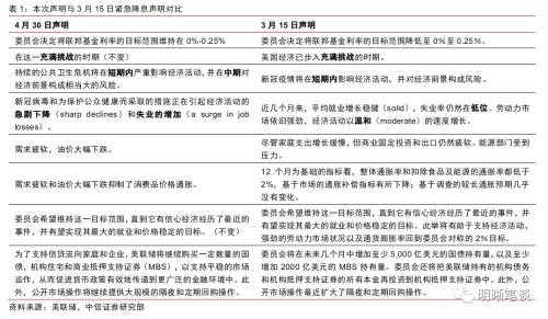 美联储强调了疫情的严重影响,对当前经济形势的判断较为悲观,但没有给出前瞻指引。美联储声称,新冠病毒的爆发正在整个美国乃至世界范围内造成巨大的健康危机和经济困难,疫情和为保护公众健康而采取的措施正在引起经济活动的急剧下降和失业的增加。需求疲软和油价大幅下跌抑制了消费品价格通胀,国内外经济活动的中断严重影响了金融状况,并损害了向美国家庭和企业的信贷流动。相比于3月15日美联储降息100bp时的会议声明,本次会议声明强调了疫情对经济的严重影响,并指出,持续的公共卫生危机将在中期对经济前景构成相当大的风险。相比而言,本次会议声明对当前经济形势和中短期经济前景的判断更加悲观。