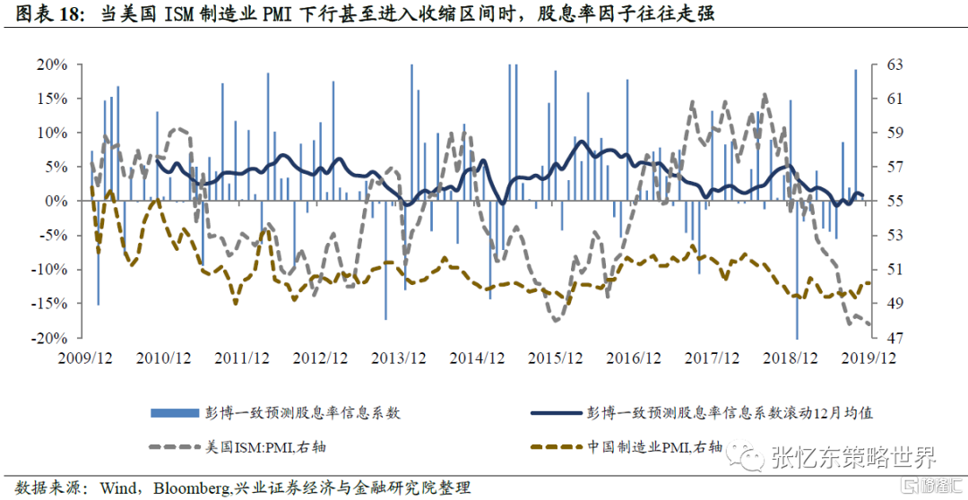 整体从走势上,预期分红率因子对于股息率因子的走势上主导相对更为明显,所以股息率的防守属性更为突出。当美国ISM制造业PMI下行甚至进入收缩区间时,股息率因子往往走强。