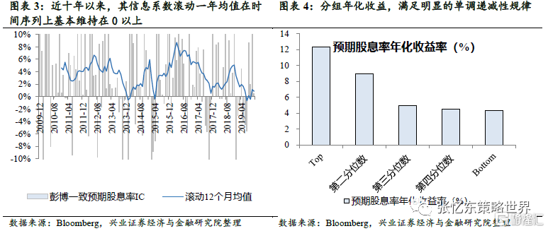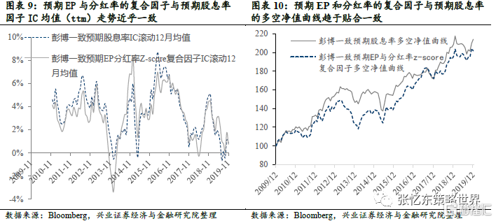 我们构建了彭博一致预期的市盈率倒数(预期EP)、预期每股股利/每股收益z-score(预期分红率)等权复合因子,实现了对彭博一致预期股息率的复制,发现: