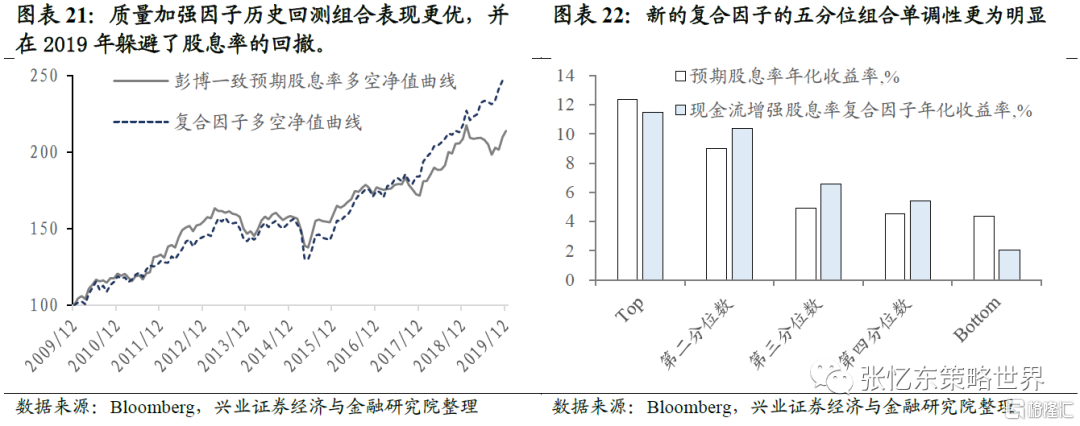 质量加强预期股息率因子历史回测组合表现更优。质量加强股息率因子多空组合夏普比率达到1.09,高于预期股息率因子的0.95。并且,新的复合因子的五分位组合年化收益率单调性更为明显,末尾组合剔除效果更佳。质量加强股息率因子多空组合净值曲线收益风险比更高,并在2019年躲避了股息率因子多空组合的回撤。