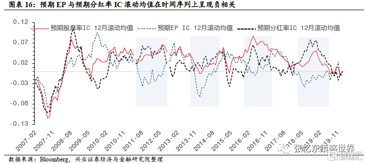 第三,从IC的时间序列分布情况来看,预期市盈率与未来收益率的相关性最不稳定,频繁的在0附近的正负区间内波动。而预期分红率和股息率相对而言更为稳定。