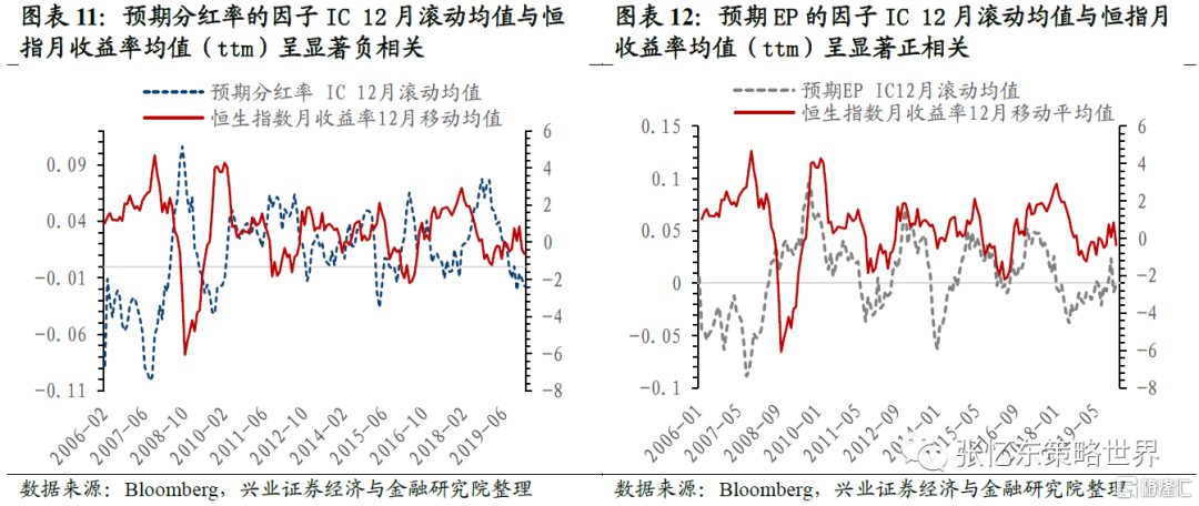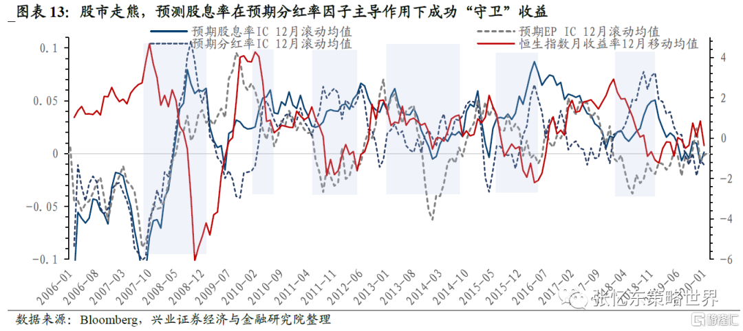 从数据来看,高分红率公司抗跌,低估值公司进攻凸显。预期分红率因子IC12月滚动均值与股市走势负相关,防守属性凸显;而预期EP因子除了06年期间拉升力度不足,07年走势背离规律趋势外,此后一直与恒指月收益率12月移动平均值显著正相关,随着股市走强而强化“进攻”特征。