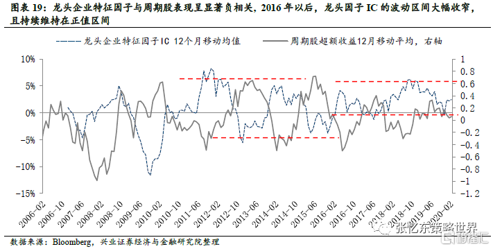 我们同时也发现自从2016年以后,龙头因子IC的波动区间大幅收窄,且持续维持在正值区间。2016年这个时点也是我们国家经济增长方式转型的关键年份——2016年见证了固定资产投资/GDP占比回落前的顶部。在去产能、供给侧结构性改革的背景之下,龙头公司的超额收益愈发凸显,符合我们一贯强调的“核心资产”理念。