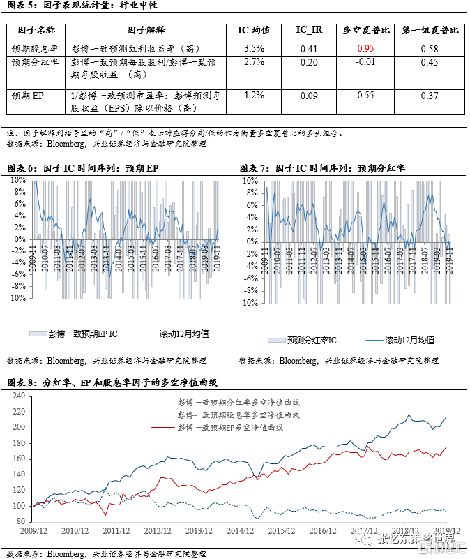 其次,单独来看,预期E P和预期分红率表现不佳。单独来看,在行业中性之后,虽然预期分红率IC可以达3.5%,但是其多空组合夏普比约等于0,预期EP的截面收益解释力低,其IC仅为1.2%;IC_IR的角度,预期股息率因子高到0.4,高于预期分红率的0.2和预期EP的0.09。
