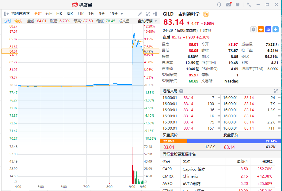 在股票恢复交易后,吉利德股价在美股盘前迅速涨超10%。整个市场也因此得到提振,美国三大股指期货在吉利德声明发布后飙升。截至周三收盘,吉利德股价上涨5.68%,标普500指数涨幅也达到2.66%。