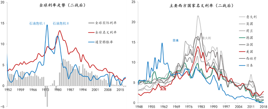 综合来说,我们认为,推动战后全球利率时序上行和债券大熊市主要因素有三个:第一,战争重创全球产业,百废待兴,工业基础虐待重建,被中断了的第三次科技革命与第四次科技革命在战后快速扩散,科技要素除外,战后婴儿潮还增加了劳动供给,这些因素都从供给侧提供了动量;第二,1980年代之前,西方主要国家不同收入阶层的收入普涨,贫富分化收窄,“供给创造需求”的逻辑成立;供求两方面的结果就是全要素生产率、GDP增速和企业利润都同步上行,中性利率也随之上行。第三,1970年代之后,另外两个力量将熊市推向新高度,一个是信用货币体制在全球的建立,另一个是石油价格保障引发“滞胀”,前者改变了货币和流动性环境,后者中断了经济增长的黄金时期,两者共同导致的大通胀将名义利率推向峰值。