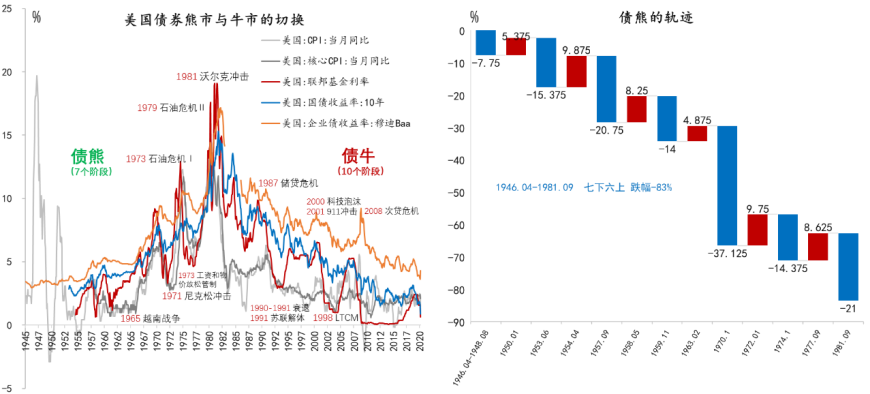 南北战争以来的150多年历史,美国经历了两轮债券熊市:第一轮为1899-1920年,第二轮为1946-1981年。比较而言,第二轮熊市的深度堪称债市“大萧条”。1946-1981年,长期债务加权名义利率从1.6%升到了14%,增长了1240个基点;十年期国债收益率从2.4%上涨到了15.6%,增长了1340个基点;穆迪BAA级企业债收益率从3.17%升到了17.19%,增1400个基点;按债券价格指数计算,如果1946年是100,到1981年,已经跌至20以下,跌幅超过80%,与大萧条期间道琼斯指数的跌幅(89%)相近。而在第一次债券熊市中,债券指数的跌幅约为35%。