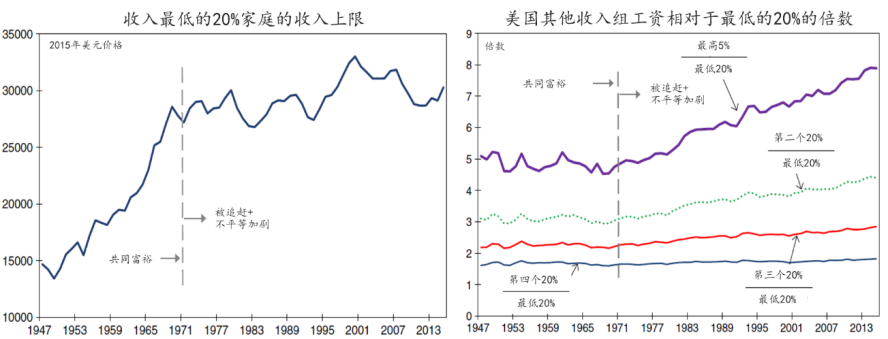 债券熊市的第二阶段(1973-1981),石油价格冲击和科技革命动能的衰减,使得供给曲线由第一阶段的右移转变为左移;新自由主义代替凯恩斯主义成为主流,金融自由化消除了利率上限约束;1979年沃尔克上任之后,美联储的货币政策转而盯住货币供应量,任由利率在平衡市场供求关系中决定;一个值得注意的变化出现在劳动力市场(图3)。1971年可被视为美国劳动者工资从增长到停滞,以及收入分配恶化的起点,即由之前的共同富裕转变为之后的收入分化。收入最低的20%的家庭的工资上限在1971年之后就增速放缓,最高的5%的劳动者工资与最低的20%的工资差距越拉越大。辜朝明(Koo,2018,p.63)认为这表明一个经济体进入了“被追赶阶段”,这是由全球化和美国制造业外迁导致的。劳动工资的停滞限制了私人部门需求的扩张。本阶段宏观经济运行的特征是:经济停滞+工资停滞+失业率上升+通货膨胀,这是典型的供给曲线左移占主导的结果(需求曲线小幅左移或右移)。通货膨胀率1981-1982年的经济衰退中达到峰值,政策利率和债券名义利率随着被动抬升,20年期政府债券的收益率达到15.78%的水平,为美利坚合众国建国以来的最高水平。