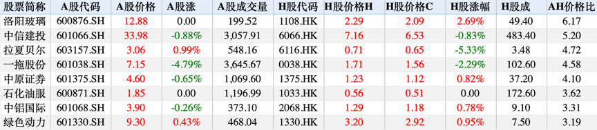 个股方面,洛阳玻璃、中信建投、拉夏贝尔溢价比位列前三,呈现出A股价格是其H股价格4倍甚至6倍的溢价情况,投资者或可警惕其中风险。