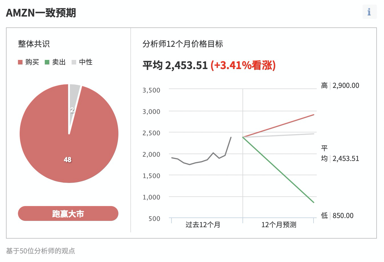 在亚马逊的股价连续走高以后,华尔街仍然不乏持续看好该股的分析师,英为财情Investing.com的一致预期工具显示,在华尔街覆盖该股的50位分析师中,有48位分析师仍然维持“买入”评级,另外有两位分析师给予“持有”评级。平均股价目标为2453.51美元,较当前股价有3.41%上涨空间。
