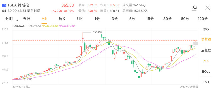 华盛资讯4月30日讯,受财报业绩提振,特斯拉(TSLA)股价开盘大涨,一度涨超8%。截至发稿,特斯拉股价大涨8.09%,现报865.3美元,当前成交量364.56万股,当前总市值1595.52亿美元。