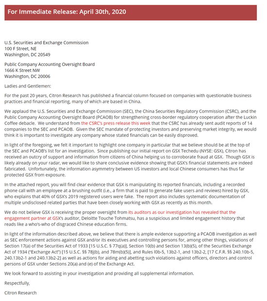 4月30日晚,香橼研究发布了针对跟谁学(GSX.US)沽空报告的第二部分,此前香橼在这份报告的第一部分中指出该公司虚构70%营收,学生人数及收入与实际状况不符。