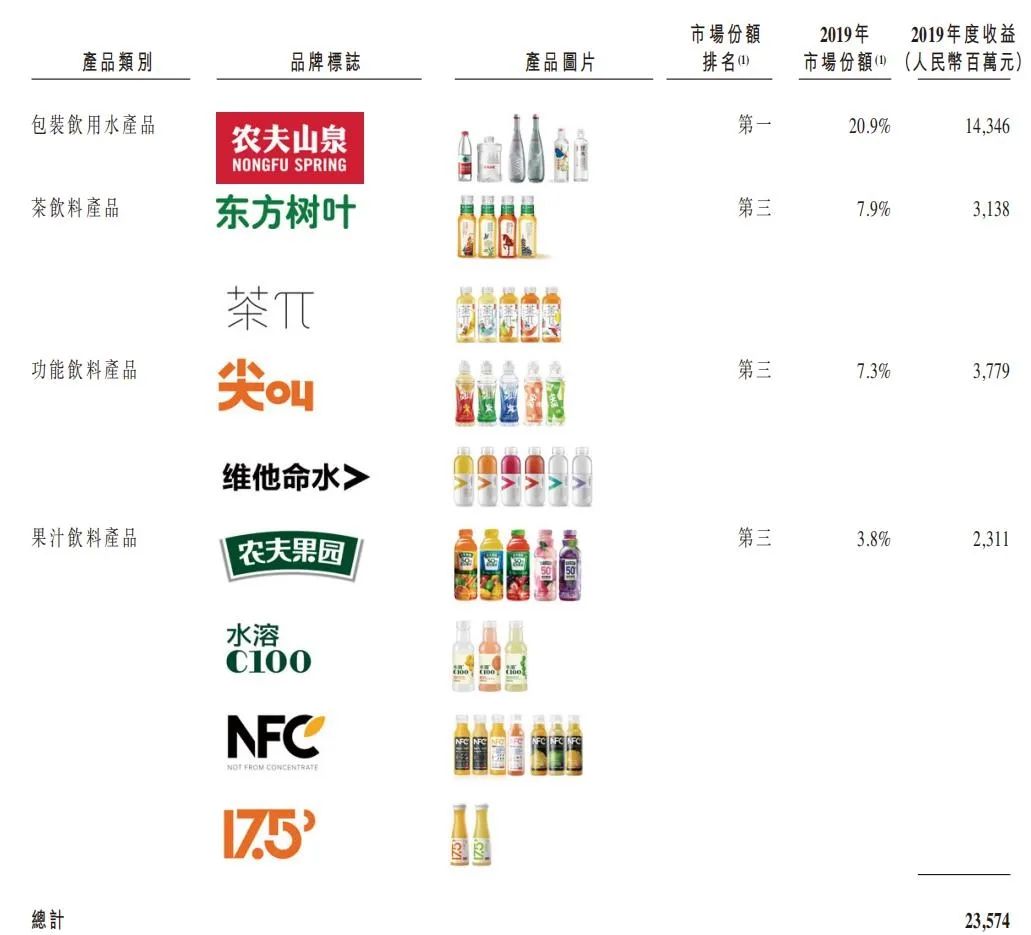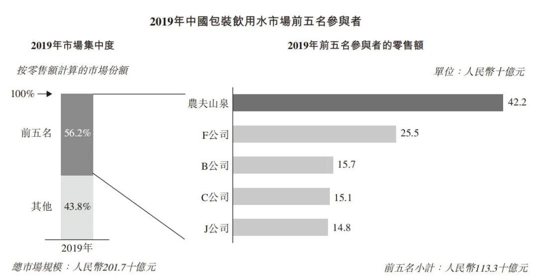 农夫山泉主打包装饮用水。根据弗若斯特沙利文报告,中国包装饮用水市场相对集中,2019年零售总规模达到2017亿元,前五名参与者合共占56.2%的市场份额。
