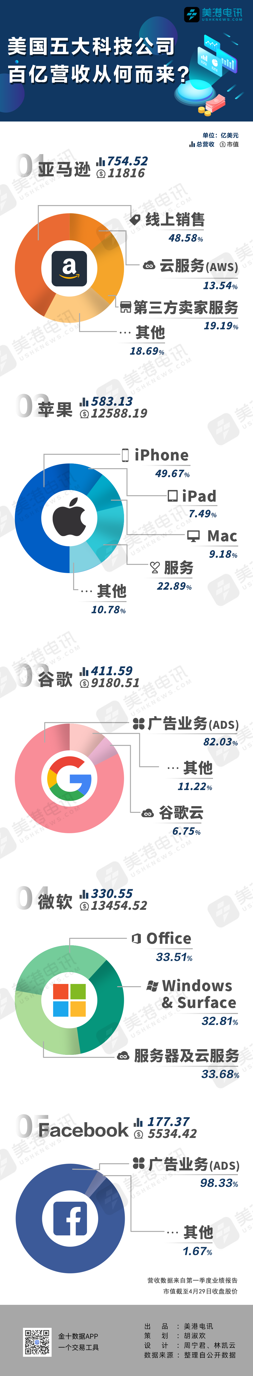 美国五大科技公司亚马逊、苹果、谷歌、微软、Facebook一季度总计营收达2257亿元,其中亚马逊的营收最高,录得754.52亿美元;这五家公司的总市值约为5.26万亿,占据标普500指数全部个股总市值的24%。