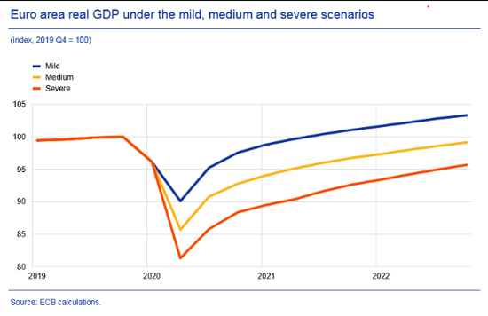 欧洲央行表示,由于遏制新冠病毒大流行蔓延而采取的限制措施,欧元区今年的GDP可能萎缩高达12%。