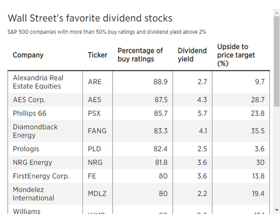 CNBC利用FactSet找到了最受欢迎华尔街的派息股票。CNBC对所有标准普尔500指数成份股进行了分类,以寻找那些获得买入评级比例最高、股息健康的股票。这份榜单的特点是,所有股票的股息率都高于目前市场2%的股息率。