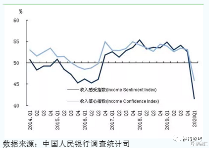日前,央妈发布的《2020 年第一季度城镇储户问卷调查报告》显示,一季度国人的收入感受指数为41.6%,环比下降11%;27.5%的居民认为收入“减少”。收入信心指数为45.9%,环比下降7.2%。触及低点。