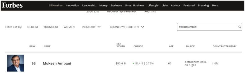 根据美国《福布斯》杂志北京时间5月1日数据,现年63岁的安巴尼身价为534亿美元,在全球富豪排行榜中位列第16名,在亚洲排名第1。