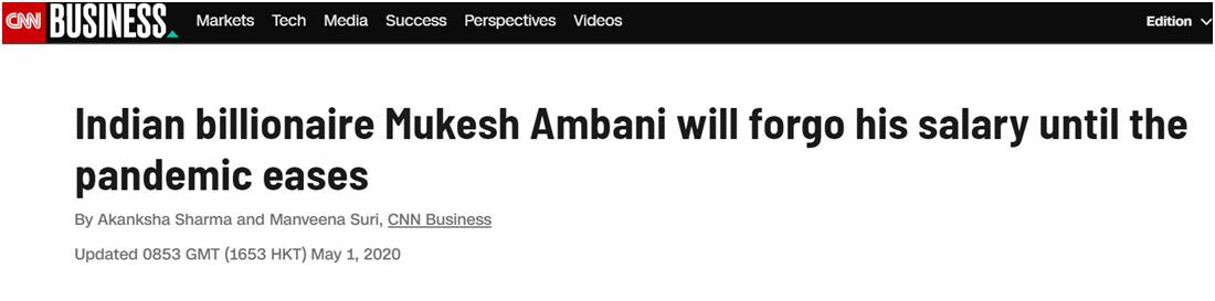 【环球网报道 记者 张晓雅】据美国有线电视新闻网(CNN)5月1日报道,(目前的)亚洲首富、印度亿万富翁穆凯什•安巴尼(Mukesh Ambani)4月30日表示,在新冠疫情缓解之前,他不会拿薪水。