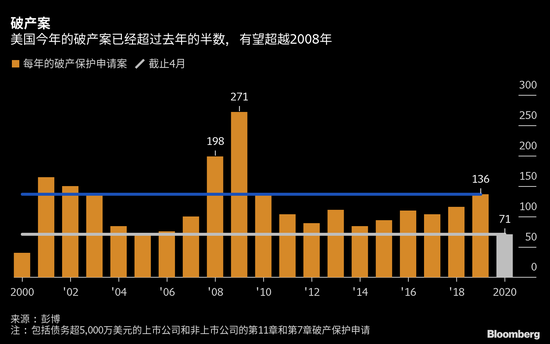 美国的破产案正在接近全球金融危机期间的水平。今年迄今已经申请破产保护、负债超过5,000万美元的71家公司中,有19家是在上月宣布破产的。其中包括连锁院线Cinemex Holdings USA Inc.、石油钻探承包商Diamond Offshore Drilling Inc.和电信公司Frontier CommunicationsCorp。