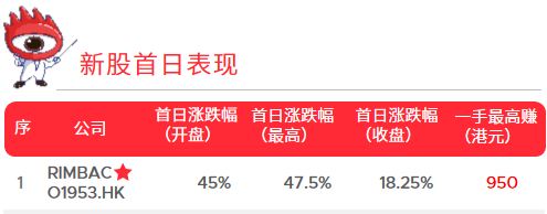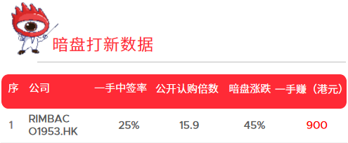 本周新股来自马来西亚的楼宇承包商Rimbaco Group,申购人数约1万6,中签率25%,超购15.9倍。公开发售刚好踩线一级回拨档位,但由于国配认购不足,按规则最多回拨20%并下限定价,暗盘惊喜大涨45%,一手收益将近1千港币,首日高开低走最终收涨18.25%,最高录得每手950港元的收益。