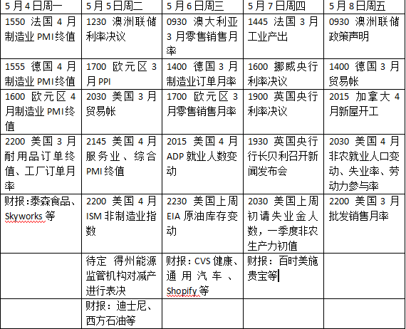 下周(5月4-8日)看点颇多,市场将继续关注疫情防控进展,澳大利亚联储、英国央行等将公布利率决议,美国将公布4月非农就业报告。