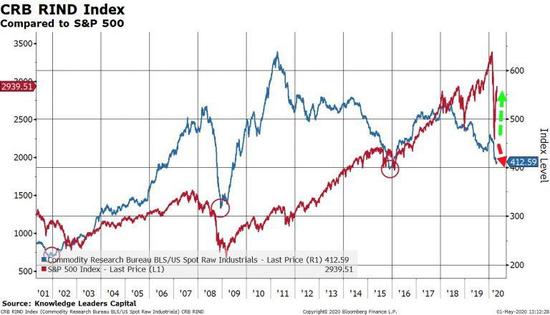 如第一张图表所示,工业大宗商品的价格通常在熊市期间股市触底之前就已经触底。历史上2001年、2008年和2015年的情况均是如此。目前,以CRB工业原材料大宗商品指数衡量的大宗商品价格处于周期低点。这是一个令人不安的背离,这也许意味着,对原材料的需求仍在下降,这种情况在经济反弹之前通常是看不到的。