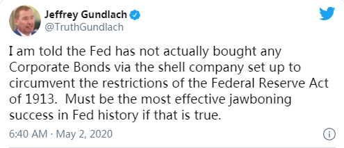 今天,“债券之王”杰夫-冈拉克(Jeff Gundlach)在社交媒体上写道:“我被告知,美联储实际上没有通过为规避1913年《联邦储备法》限制而设立的空壳公司购买任何公司债券。如果这是真的,那一定是美联储历史上最成功有效的游说。”