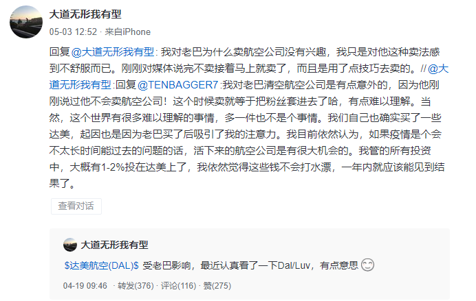 二、段永平坚持看好航空股并质疑巴菲特“套粉丝”