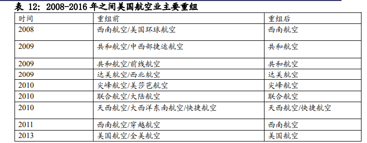 2016 年,伯克希尔哈撒韦公司买入美国航空、达美航空、美国联合航空股票,分别持股 7.9 亿美元、2.49 亿美元、2.378 亿美元,一个重要原因就在于 2008 年行业整合发生后,美国航空业已经从完全竞争市场演化为了寡头竞争,目前这四大寡头就是美国航空、达美航空、美国联合航空以及美国西南航空。