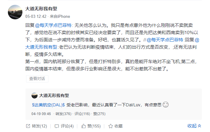 在巴菲特清仓航空股后,一直以来十分推崇巴菲特的段永平随后在网站上发文,认为巴菲特之前说过不会出售航空公司,现在这么操作,等于把粉丝套进去了。段永平还表示,自己的资金有一部分投在达美航空,并坚信这笔投资不会打水漂。