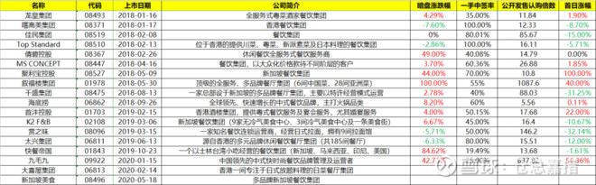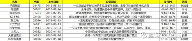 2、估值:27.16-33.2,创业板的估值是没法看的,随便一个上市开支就都会造成极大的波动,所以看看就行。以下是仓总这里有记录的餐饮公司发行估值情况,很明显可以看出,内地的餐饮企业规模比新加坡、香港的要大的多。