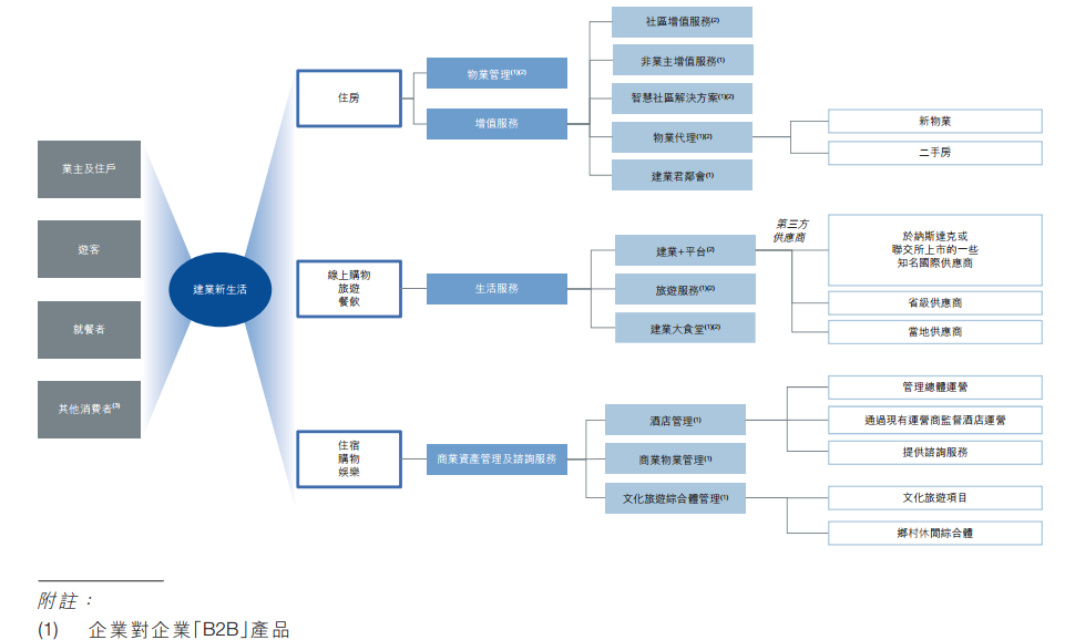 建业新生活的业务主要由三部分组成:物业管理服务及增值服务、生活服务、商业资产管理及咨询服务。
