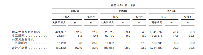 上图为2017年至2019年建业新生活三大业务的收入和毛利率明细。可以看到2019年数据中,物管和增值服务收入占比达76.4%,生活服务占比17.6%排名第二。不过虽然商业资产管理和咨询服务收入占总收入比重小,但其毛利率最高,达到66%。