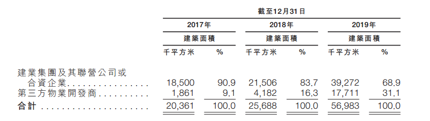 其次我们看看建业新生活的在管面积数据,截止2019年底,建业新生活总在管建筑面积为5698.3万平方米,相较2017年增长179.9%。在管面积中由建业集团及其联营、合资企业提供的建筑面积比重从2017年的90.9%降至2019年的68.9%。