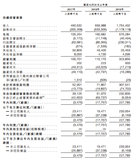建业新生活2017-2019年收入分别约为人民币4.61亿元、人民币6.94亿元及人民币17.54亿元。可以看到建业新生活在这三年营收增长迅速,2019年营收相较2017年增长达280%。