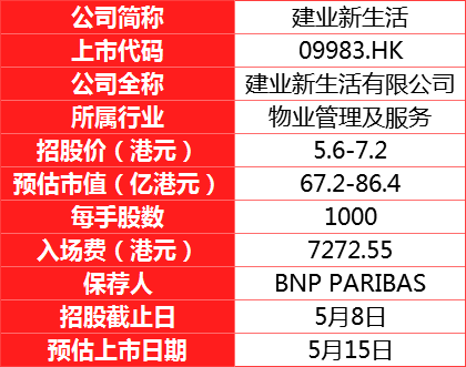 建业新生活于2020年5月5日至2020年5月8日招股,拟发行3亿股股份,其中香港发售股3000万股股份,国际发售2.7亿股。发售价为每股股份5.60港元至7.20港元。每手交易1000股,预期于2020年5月15日上市交易。
