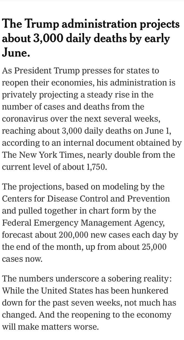 纽约时报当地时间5月4日报道,特朗普政府在呼吁重启经济的同时,纽约时报获得的一份政府内部文件显示,政府预测单日新冠肺炎死亡病例或将在6月1日达到日增3000例,与目前相比几乎翻倍。