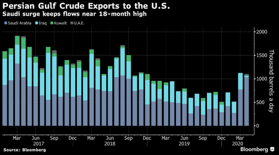 观察到的波斯湾OPEC国家(伊朗除外)对中国出口在4月飙升至476万桶/日的空前水平,沙特和伊拉克的对华出口都飙升至彭博2017年初开始详细追踪流量以来的最高水平。