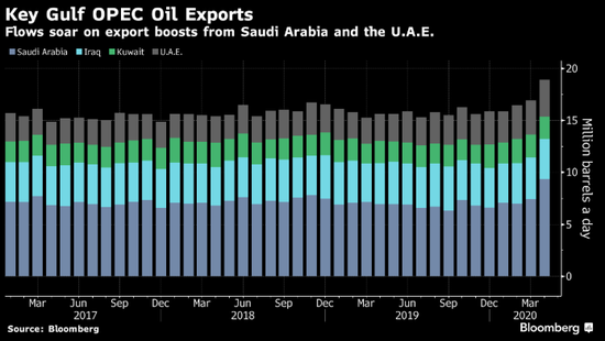 彭博汇总的油轮跟踪数据显示,沙特、伊拉克、科威特和阿联酋4月份日均出口原油和凝析油1,890万桶,比3月份修正后的日均出口量增加了200万桶。这4国约占OPEC总产量的70%。
