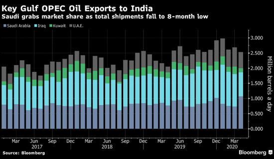 印度是中东石油最近的主要市场,但4月进口小幅下降。沙特的激进定价使其对印度出口增长了46%,达到至少2017年初以来的最高水平,而伊拉克对印度的出口被压缩到近两年来的最低水平。印度的炼油厂正在利用廉价的沙特原油来大量增加库存,即使该国的陆上储油罐接近装满。