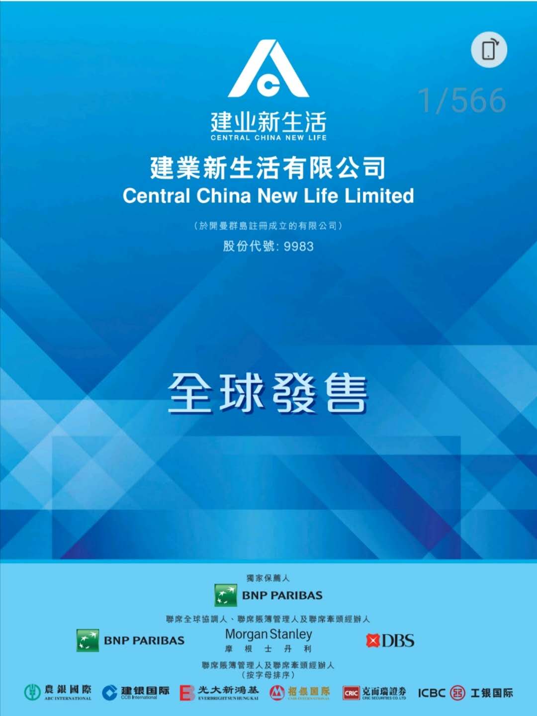 建业新生活于2020年5月5日至2020年5月8日招股,拟发行3亿股股份,其中香港发售股3000万股股份,国际发售2.7亿股。发售价为每股股份5.60港元至7.20港元。每手交易1000股,入场费7272.55港元,预期于2020年5月15日上市交易,保荐人法国巴黎银行。
