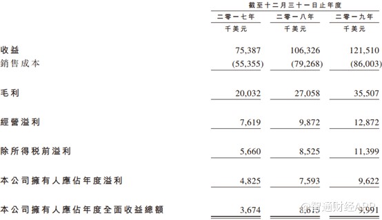 招股书显示,公司的产品几乎全部销往海外,收益自2017年度的7540万美元增加至2018年的1.063亿美元,并在2019年再度增长至的1.215亿美元,复合年增长率为26.9%。纯利方面,由2017年约482.5万美元逐年增长至2019年时的962.2万美元,复合年增长率为41.4%。近三年内,整体还是呈现较为高速的增长,且由于若干主要原材料的平均采购价格下降,公司的整体毛利率由2018年时的25.4%上升至2019年约29.2%。