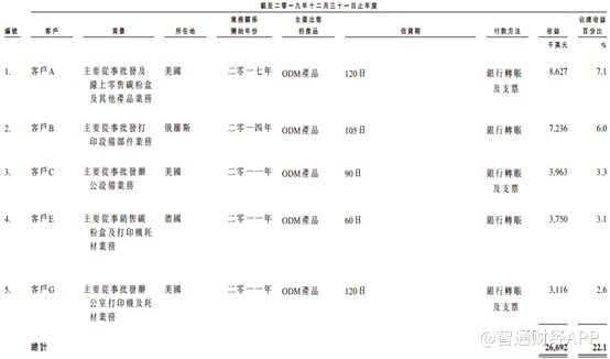 智通财经观测到,向公司采购ODM产品的客户通常为以中型至大型企业、政府组织或教育机构为目标向其出售,其需求通常较为稳定。星图国际的前五大客户为主要采购ODM产品的客户,多为从事批发打印设备或者办公设备的业务。公司前五大客户于2017-2019年分别贡献总收益的29.2%、19.6%及22.1%。而其最大客户于近三年分别占总收益约8.5%、5.7%及7.1%。