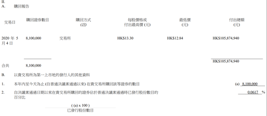 新浪港股讯 5月5日消息,中国恒大(03333.HK)公告,于2020年5月4日,公司按每股12.84-13.3港元,耗资1.06亿港元回购810万股。
