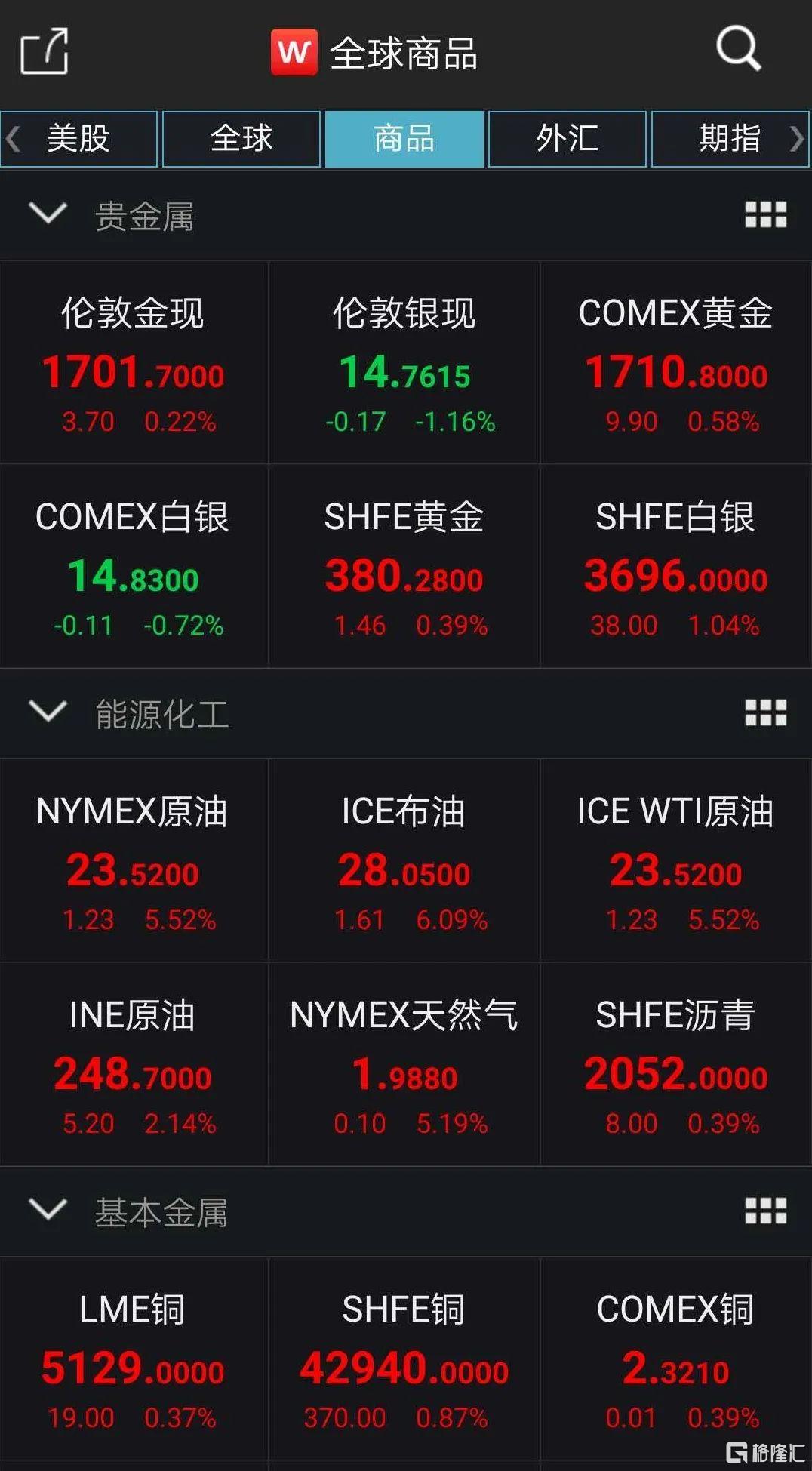 国际油价早盘普跌,但随后也跟随美股震荡走高。截至5月4日收盘,美油6月合约收涨7.08%,报21.18美元/桶,连涨五天,刷新4月20日以来新高;美油7月合约收涨5.52%,报23.52美元/桶。布油收涨5.79%,报27.97美元/桶。