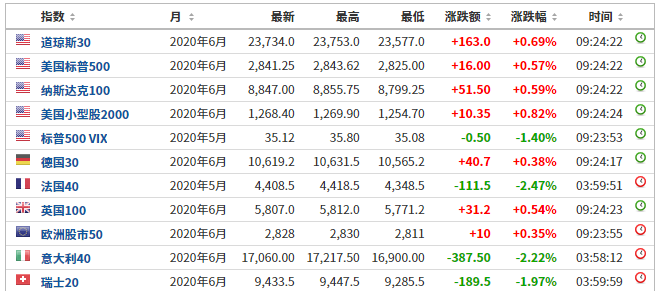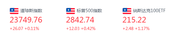 道指涨26.07点,或0.11%,报23749.76点;纳指涨105.77点,或1.23%,报8710.71点;标普500指数涨12.03点,或0.42%,报2842.74点。