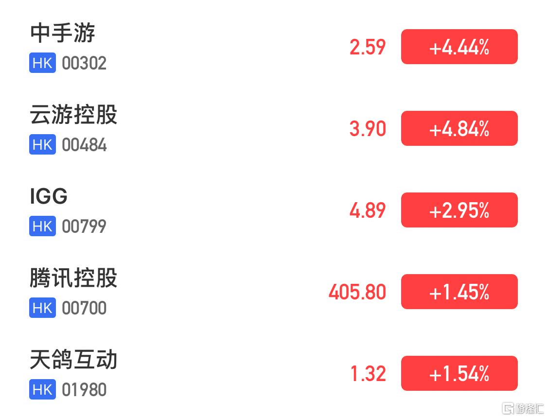 手游股普遍上涨,云游控股涨近5%领涨,中手游升4.44%,腾讯亦涨1.45%。