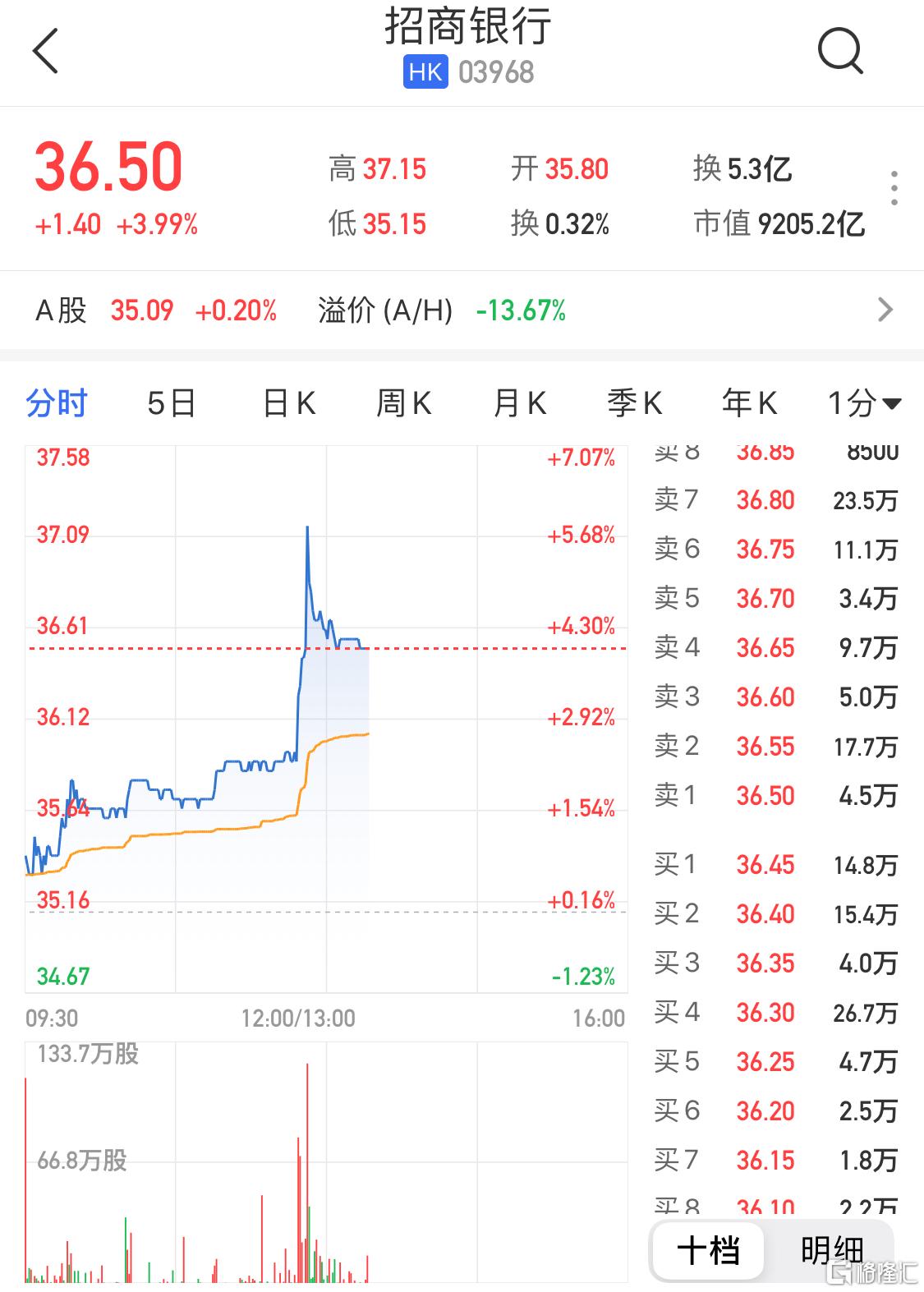 格隆汇5月5日丨招商银行(03968.HK)午后开盘直线拉升至近6%,现涨幅收窄至3.99%,报36.5港元,暂成交5.3亿港元,最新总市值9205亿港元。