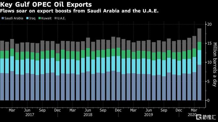 沙特、伊拉克、科威特和阿联酋占了OPEC整体石油出口量的70%。油库追踪数据显示,这四个国家上周的原油和凝析油日均发货量为1890万桶,比修正后的3月份水平增加了200万桶。